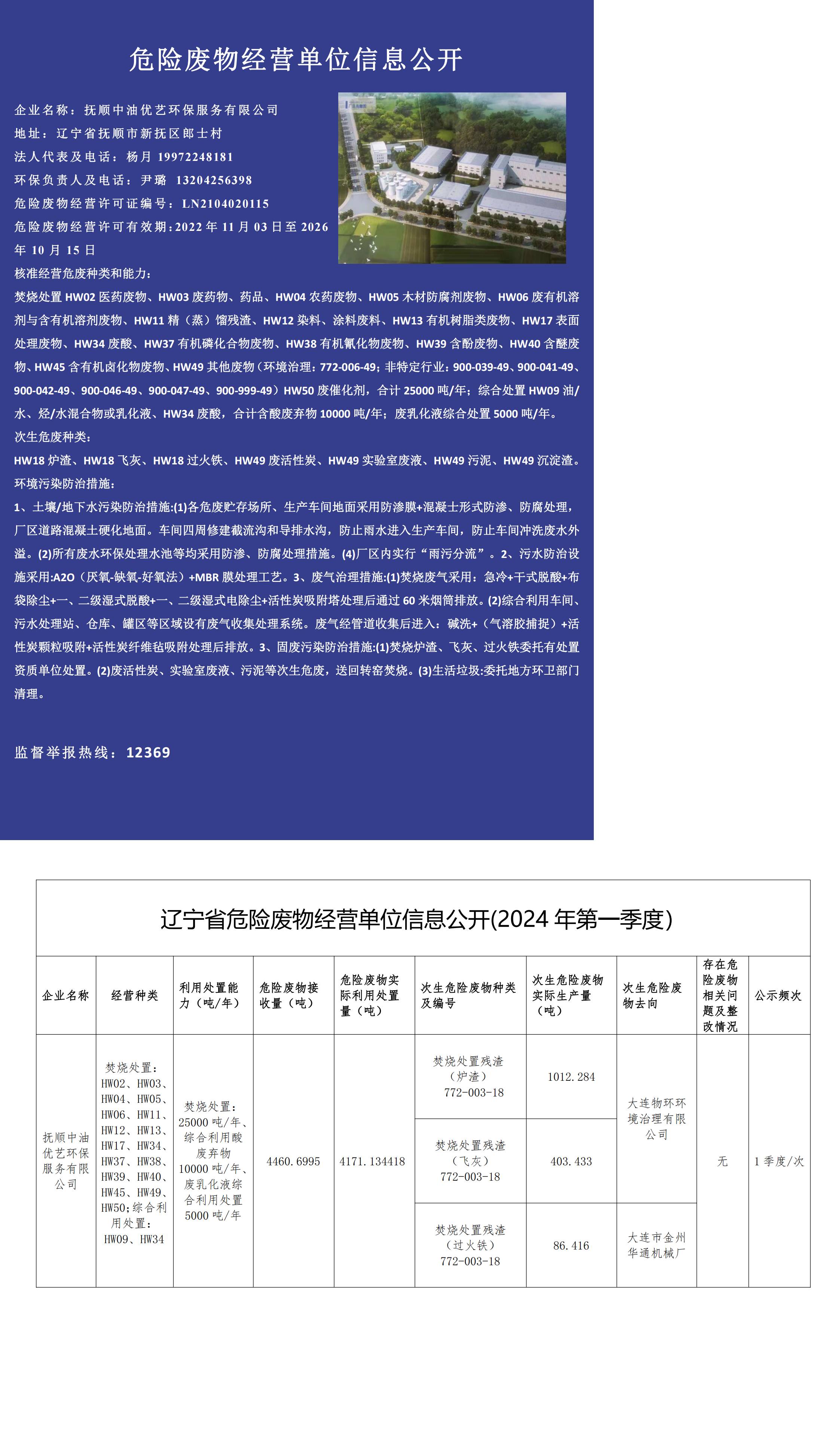 撫順中油優(yōu)藝環(huán)保服務(wù)有限公司2024年第一季度危險(xiǎn)廢物經(jīng)營(yíng)單位信息公開